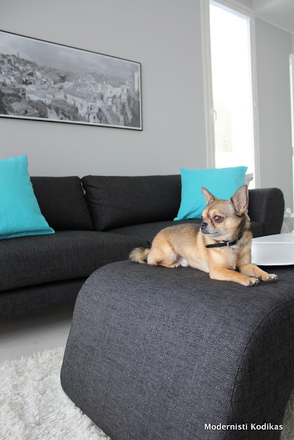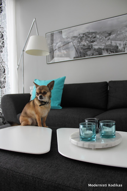 Vaikka harmaa hurmaa minut jokaisena vuodenaikana, olen aika vaihtelunhaluinen ihminen. Tällä kertaa kaivelin kaapista ehkä noin 10 vuotta vanhat Indiskan turkoosit tyynynpäälliset, niiden avulla ja muutaman pienen sisustusidean kanssa olohuone sai uuden pirteämmän ilmeen.