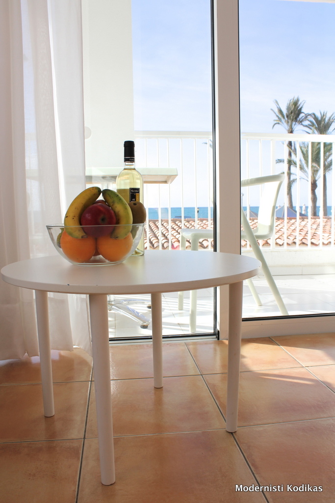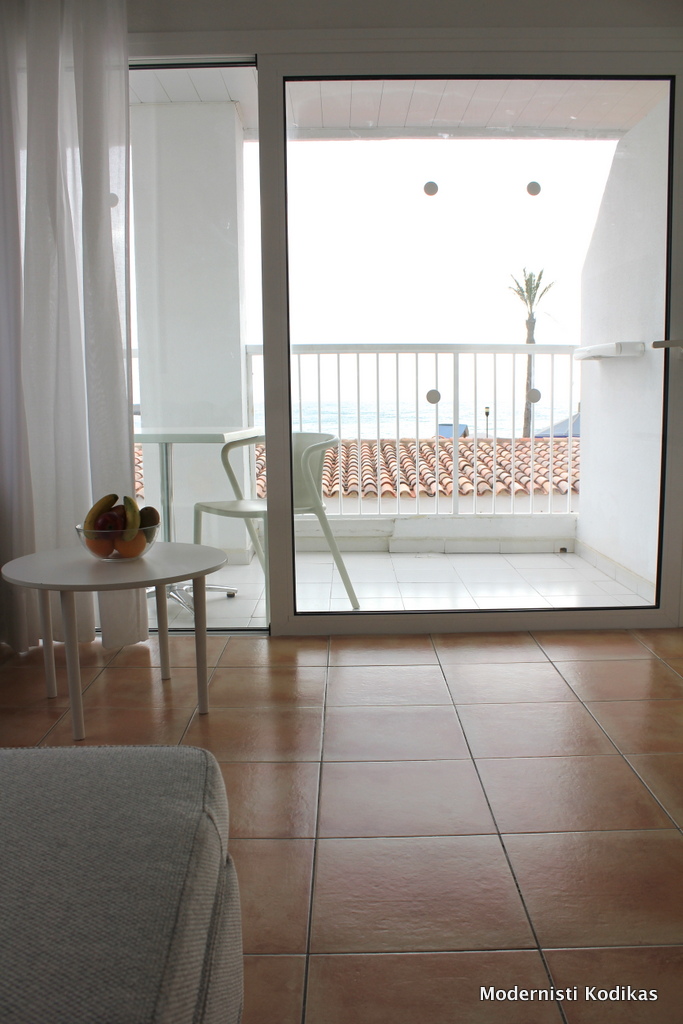Huoneet olivat hiljattain remontoituja ja hyvässä kunnossa. Värit olivat vaaleita ja kalustus modernia. Huoneen päätyseinä avautui koko huoneen levyiselle terassille. Me olimme ensimmäisessä kerroksessa, mutta ihan suuren hotellirakennuksen reunalla niin, että huoneistollamme oli vain yksi sivunaapuri. Näköala avautui katon yli merelle.