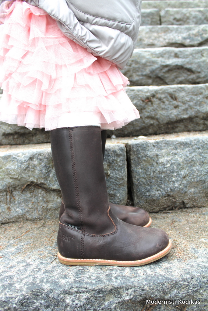 Pikkuneiti hienohelma sai rennot ja mukavat, mutta tyylikkäät nahkasaappat. Tytär on nyt neljävuotiaana aika tarkka vaateasioista ja nauttii siitä, kun saa pukea sieviä vaatteita päälleen. Saapikkaat ovat olleet testissä jo muutaman viikon ja jos tyttö saa valita, lähtevät nämä lämminvuoriset kengät jalkaan. Saappaiden merkki on Enfant.