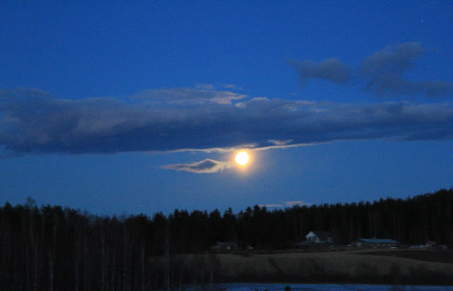 Katsokaa mikä kuu! Olenkin kertonut, että uudella asuinalueellamme meidän tiellä ei ole vielä katuvaloja. Pitkä ja pimeä talvi on onneksi takana ja näistä valoisista illoista osaa todella nauttia. Eilen illalla Hugon iltalenkillä katse nauliutui upeaakin upeampaan kuuhun. Noin klo 23 aikaa oli myös osittainen kuunpimennys ja se näky oli sellainen, että se sai unisemmankin iltalenkittäjän pysähtymään.