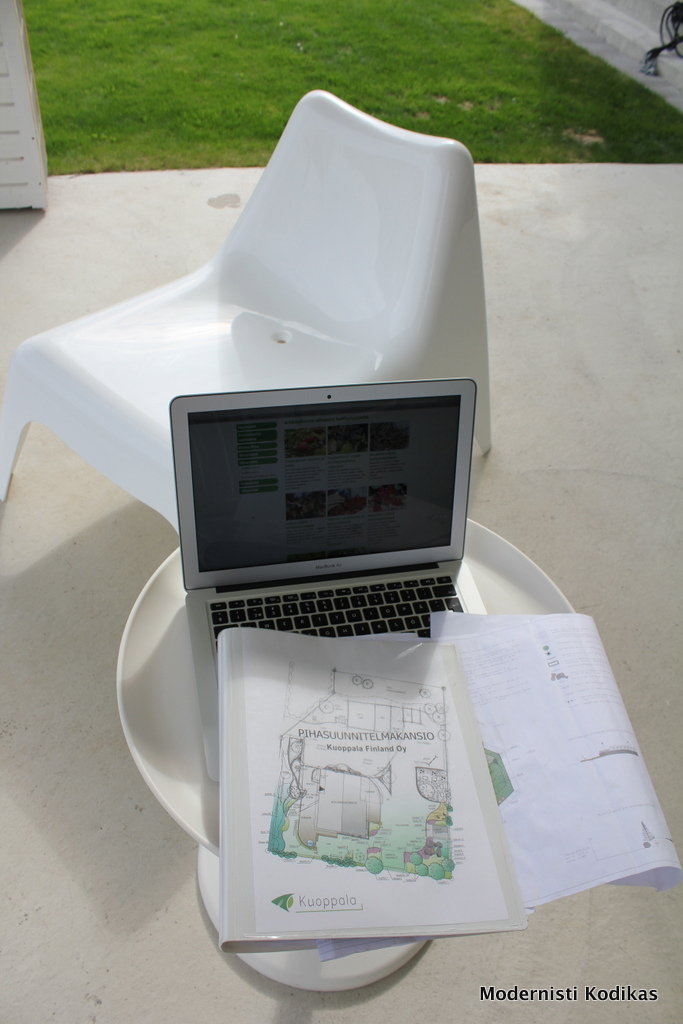 Raittiissa ilmassa valmistelin hyötypuutarhapenkkiäni ja tutkin, mitä pihasuunnittelijamme on sinne ajatellut. Tässä pihamme tulevaa satoa, marjoja lukuunottamatta kaikki on istuttamatta: