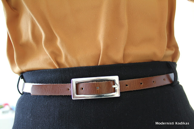 Tykkään kovasti asustasi, ja se antoi inspiraatiota kokeilla kapeaa vyötä oman kynähameeni kanssa. Välttelin niitä pitkään, kunnes löysin Tigerin mallistosta aivan loistavan mallin. Koska malli on niin hyvä, hankin samanlaisen harmaan hameen.