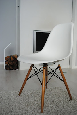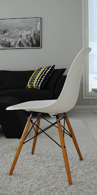 Hyvä esimerkki kauniista huonekalusta on Eamesin DSW-tuoli. Se on ollut meillä työhuoneessa, mutta innostuin sovittelemaan sitä myös olohuoneeseen lisäistuimeksi.
