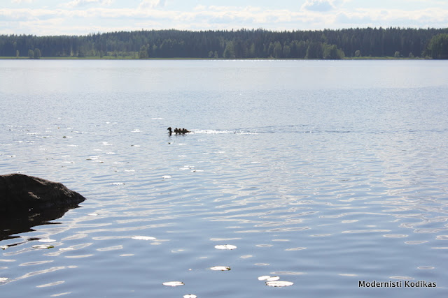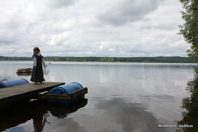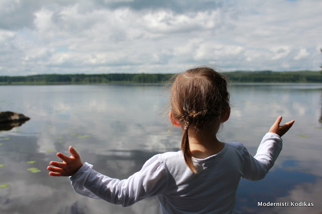 Yrityksemme perehdyttää lapsia perinneleikkeihin jäi aika vaatimattomaksi. Mikään ei nimittäin voittanut uimista ja rantavedessä kahlaamista. Tyttömme oli järvessä tuntikausia ja teki omia tutkimuksiaan. Oli ihana vain istua vieressä ja katsoa, kuinka toinen nautti olostaan.