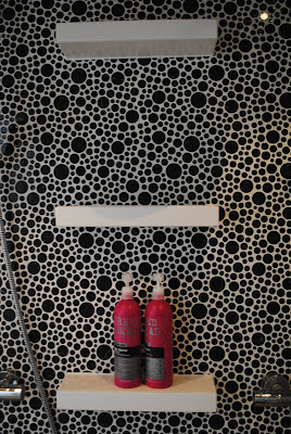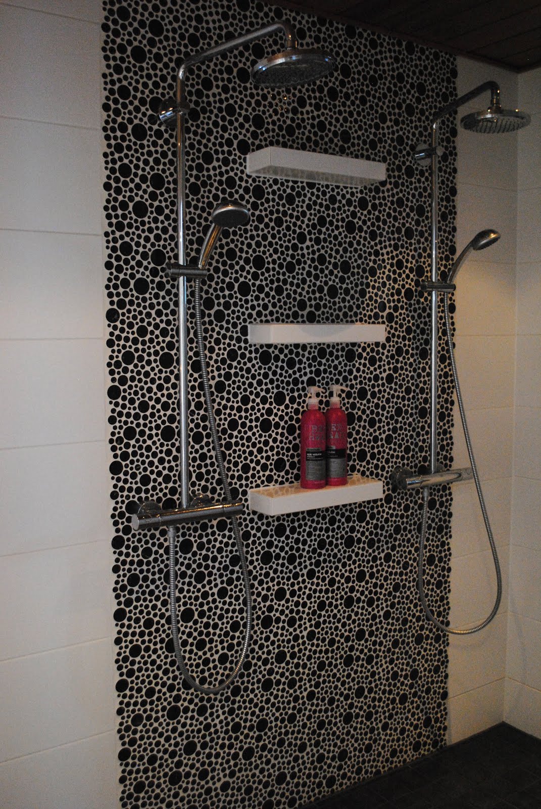 Talon rakentamisen edistyessä aloin pohtia, olisiko laatta sittenkin liikaa klassiseen ja ajattomaan tyyliin pyrkivässä sisustuksessa. Koska kylpyhuoneen muu sisustus on niin yksinkertainen ja valkoiset muuratut shampootelineet rauhoittavat kokonaisuutta, päätin luottaa intuiitioon. Kun pallolaattaseinä oli valmis, katseli sitä tyytyväisin mielin. Se ei ole klassisin valinta, mutta omannäköinen ja hauska se on. Nyt voi sitten suihkussa katsella mustavalkoisten saippuakuplien iloista matkaa, joka muistattaa siitä, että sisustamista ei saa ottaa liian vakavasti 🙂