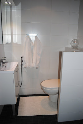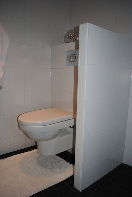 Kylpyhuoneeseen on mahdutettu perustoiminnot eli talon toinen WC ja kaksi suihkua.Wc sijaitsee 120 cm korkea puoliseinän takana. Meidän wc-istuimet ovat seinään kiinnitettävää mallia. Pidän niiden modernin yksinkertaisesta ilmeestä sekä käytännöllisyydessä. Wc-istuimen alta on helppo pyyhkiä pölyt.