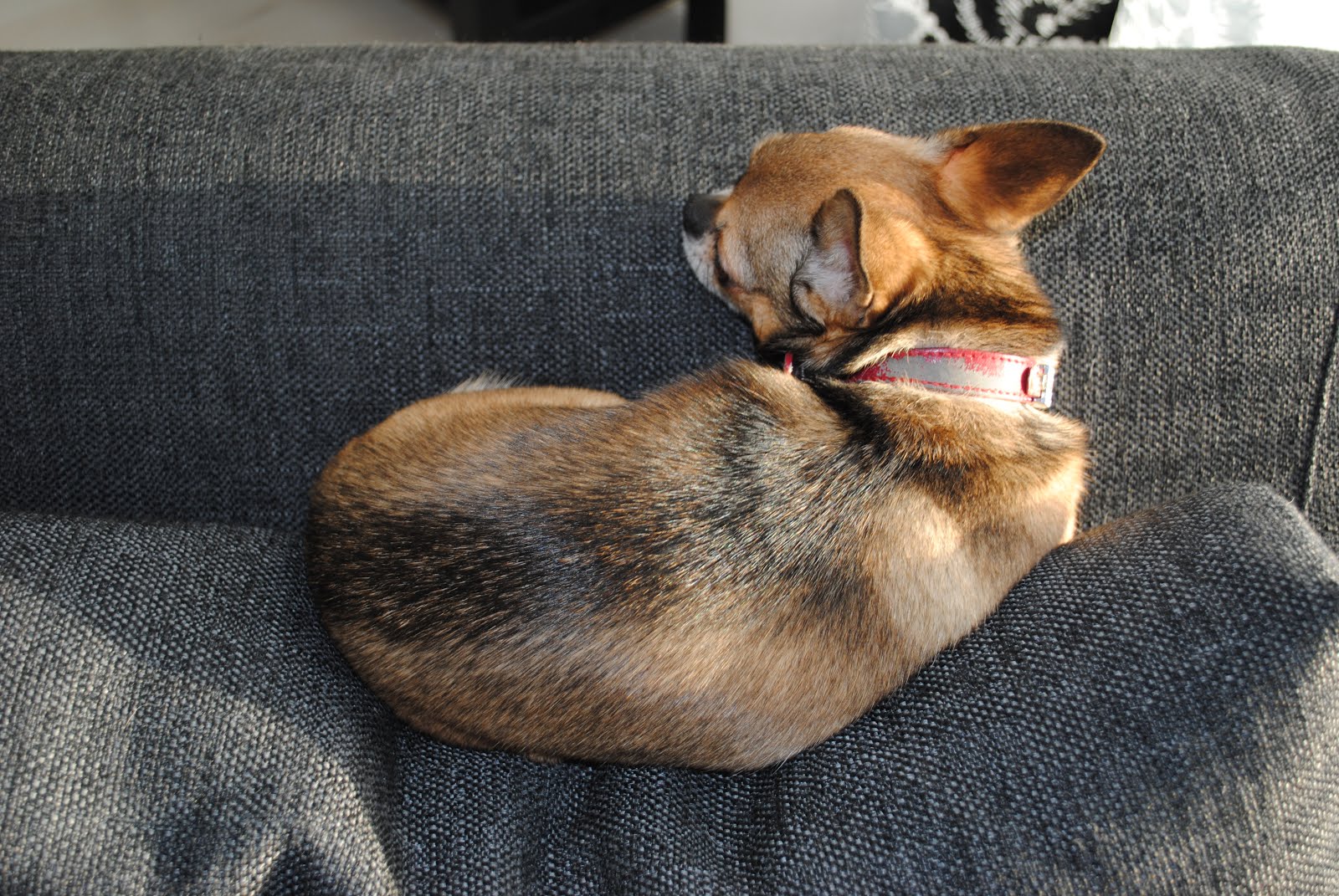 Söpö koira teillä! Ihanan pieneen kieppiin menee. <3 Meillä on niiin hemmoteltu koira täällä vissiin, koska me aina nostetaan Maija meidän sänkyyn nukkumaan 😮 Maijalla on oma paikka sängyn vieressä, jossa se kyllä nukkuu yleensä yön, mutta aamulla tulee herättämään niin nostetaan se sänkyyn meidän vierelle jatkamaan unia. 🙂 Myös valkoisella sohvalla saa olla. Ja pk22 tuoleilla. Elämistä vartenhan ne kalusteet on 😉