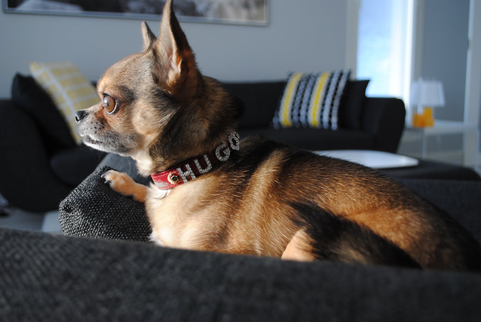 Sellainen tyyppi tuo meidän Hugo. Koiralla on kyllä oma peti sekä olohuoneessa että makuuhuoneessa. Meidän sänkyyn ei ole muuten mitään asiaa, niin sallittakoon herralle silloin tällöin torkut emännän lempituolissa 🙂