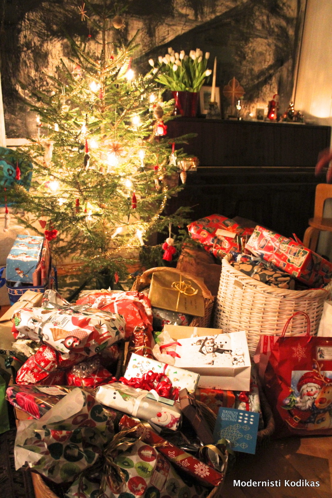 No mutta silloin kun on ollut kilttiä lapsia, tulee lahjojakin noin iso kasa! 😉 Täälläkin oli tainneet lapset ja aikuiset olla kilttejä sillä lahjoja sai jokainen, enemmän kuin tarpeeksi. Rouva kinkku sai upo uuden valkoisen kannettavan mieheltään sekä miehen tekemän ”Valkoinen Harmaja” sängynpäädyn, kyllä nyt kelpaa! 🙂 Ai niin ja täälläkin rouva Kinkku suuntasi jo aamulla sateeseen lenkille siskon kanssa, että jaksoi tänään vielä joulu pöytään anoppilaan! 🙂 Onneksi joulu on kerran vuodessa! 😉