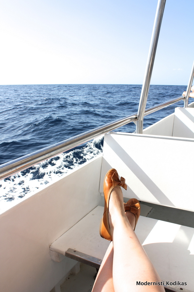 En minäkään ole delfinaarioiden tms. suurin fani. Vastuullista turismia on tarkistaa, että asiat hoidetaan eläinten kannalta arvostaen. Monissa eläintarhoissakin saattaa tulla paha mieli ;( Tässä meidän retkellä ei siis ollut mitään aitausta, vaan ihan avomerellä seilattiin ja kiikareilla bongailtiin, sattuisiko delfiinejä uimaan lähistöllä 🙂