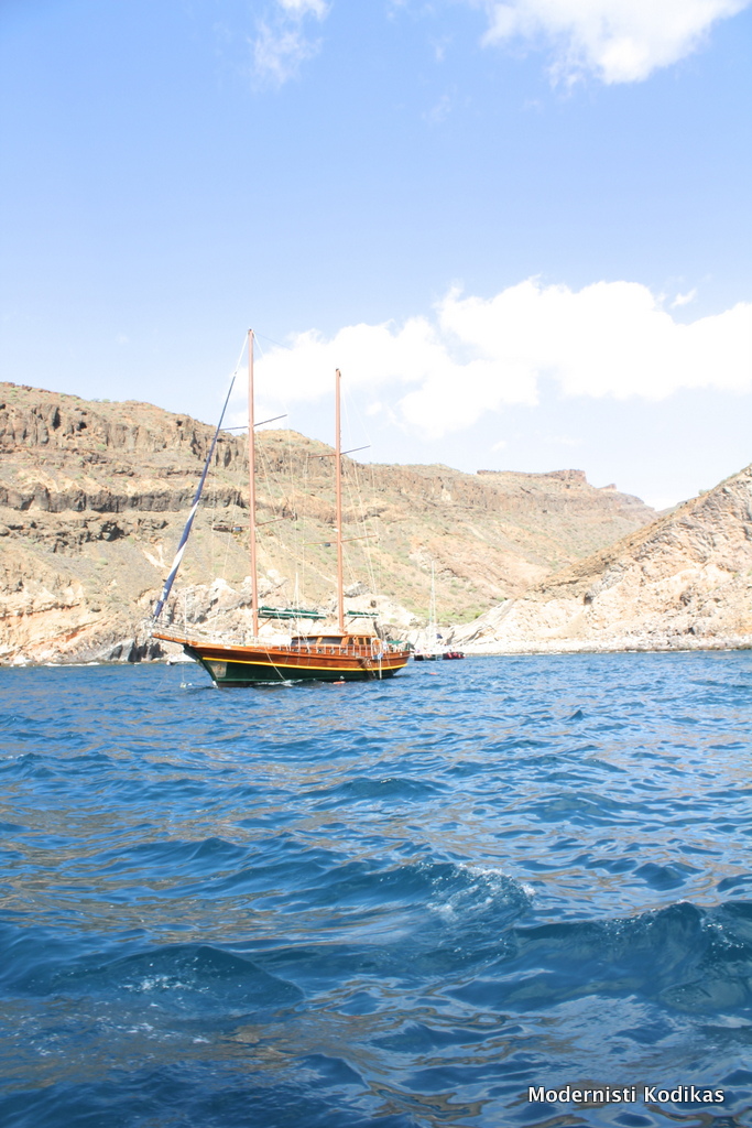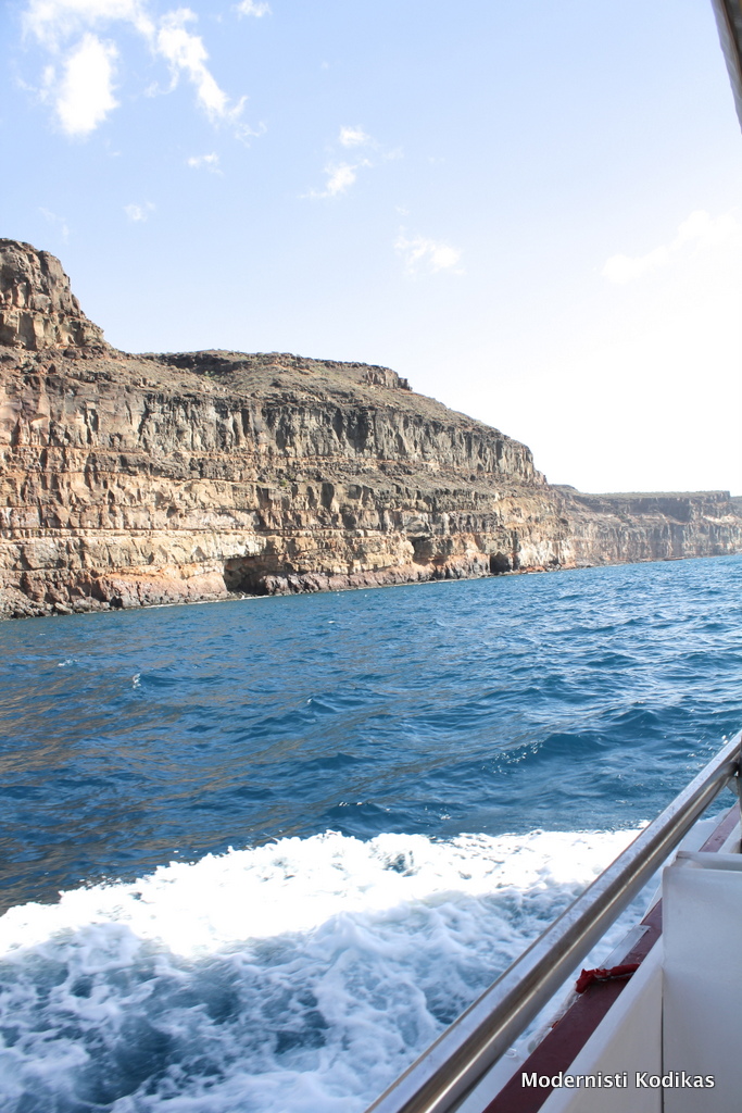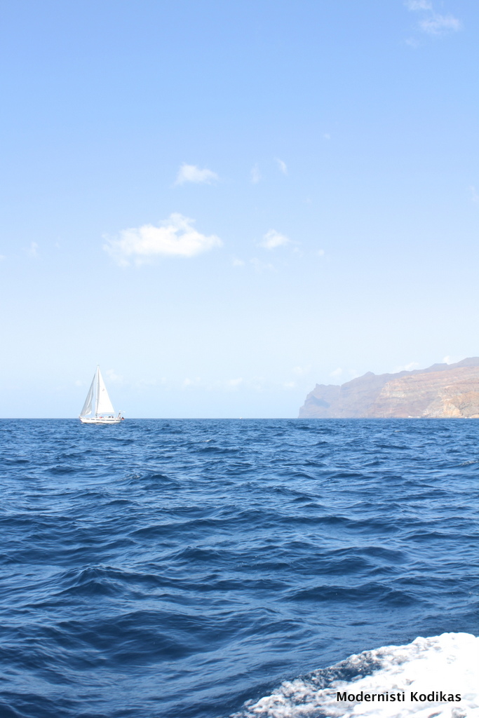 Palataan vielä parin viikon takaisin tunnelmiin Kanarialle. Takana oli pari myrskypäivää, jotka pakottivat meidät pysymään aika paljon sisätiloissa. Kun aurinkoinen aamu vihdoin koitti ja säätiedotus osasi kertoa poutaisesta päivästä, syntyi idea: olisipa hauska lähteä merelle! No, ajatushan oli ihan omani ja mies sitä yritti vähän vastustella. ”Vähän seikkailuhenkeä, kiitos! Ajattele, pilvetön taivas ja aurinkotuolit. Tässä on tällainen delfiiniretkiesite, katso! Olisihan se tytöllekin aikamoinen elämys nähdä villit delfiinit hyppelemässä valtameressä.” Pieni hiljaisuus ja ässä hihasta: ”Tässä lukee, että veneessä on baari”.