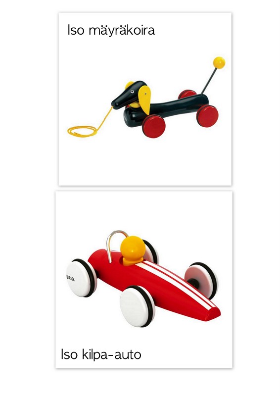 5. Brion isot puulelut, ralli-auto, n. 80 e ja mäyräkoira 93 e, Babyshop. Klassikkolelut ovat kasvaneet suuriksi ja näillä on komeat mitat. Lukijani oli teettänyt ralliautoon lapsen nimen ”rekisterilaatalle” auton takaosaan.