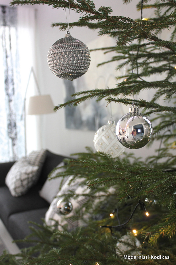 Voi miten ihanan valoisia kuvia piristämään tätä synkkää mustaa kautta! Joulukoristeiden ei todellakaan tarvitse olla perinteisen punaisia ollakseen jouluisia. Tunnustettakoon, että meillä on muuten esillä ihanat hopeanväriset ns. tunnelmavalot työhuoneessa ympäri vuoden : ) Muutenkin pyrin siihen, että en erottele esimerkiksi vaatteita niin, että nuo ovat vain talvella/kesällä pidettävia (noh – talvitakit ovat asia erikseen ja hellemekot ja shortsit tietysti). Sama pätee sisustukseen – kierrätän sisustustavaraa esille sen mukaan mikä fiilis on – en niinkään sesonkien mukaan. Aleihin taidan ennättää piipahtamaan vasta ensi viikolla ja silloinkin tavoitteena pitäytyä täsmäiskujen teossa : )
