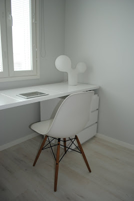 Toinen toteutunut haave on Eamesin DSW-tuoli. Sen istuinosa on helposti putsattavaa polypropyleeniä ja jalaksi valitsin petsatun vaahteran kromijalan sijaan. Ajattelin puupinnan pienissä määrissä tuovan lämpöä muuten aika musta-valko-harmaaseen sisustukseen. Työhuoneessa on myös vanhasta kodistamme mukana tullut beessi vuodesohva, jonka kanssa puunvärinen tuolinjalka sopii hyvin. Suunnittelijat Ray ja Charles Eames ovat tehneet vuonna 1950 aika hyvää työtä, kun tämä tuoli näyttää edelleen vuonna 2013 modernilta.