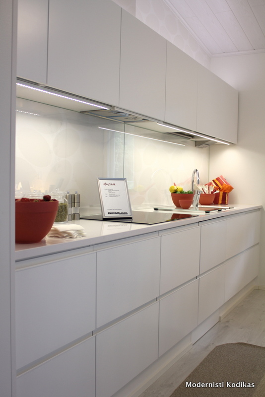 Itse tykkään korkeakiiltoisista valkoisista perusovista, mutta jotenkin jään kaipaamaan lämpöä ja väriä tasoihin taivälirilaan. Kokonaan valkoinen (tasot, kaapit, välitila ja ehvä vielä lattiakin) kuten Rock-kivitalossa on omaan silmääni liian kovaa ja steriiliä.. massiivipuisia tasoja, lämmintä pähkinän sävyä tms. ja se valaistus, se lämmin valaistus, niin olisivat mielestäni täydellisen kauniita ja kodikkaampia. Mutta maku- ja ”muotiasioita” nämäkin. Kullakin ajalla omat trendinsä. Heh..taidan olla vähän vanhanaikainen…