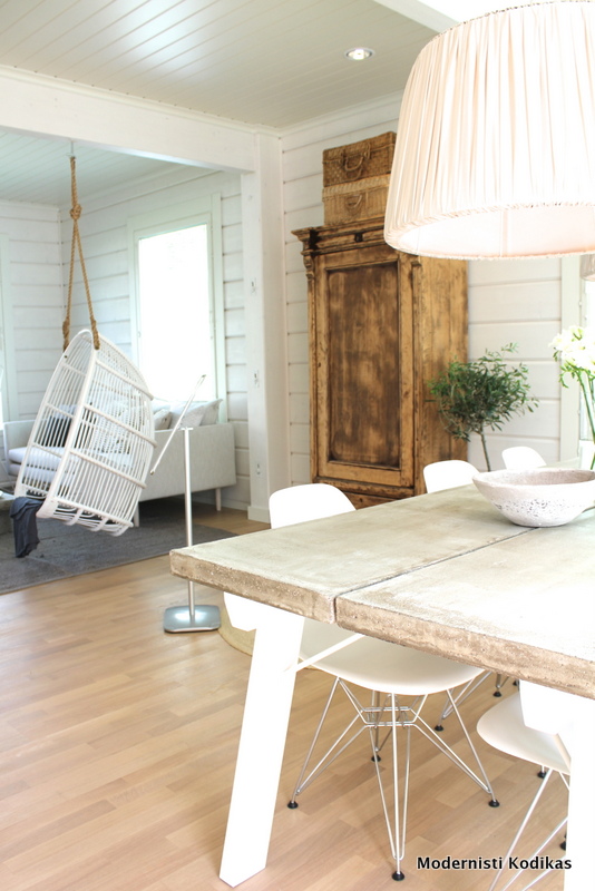 Ruokailutilan sisustuksessa on yhdistetty modernia ja perinteisempää tyyliä. Eamesin tuolit ja betonikantinen pöytä näyttivät yhdessä upeilta. Ruokapäydän päällä olevissa valaisimissa ei oltu omimmassa tyylissäni, mutta hirsitalon henkeen nämä sopivat kauniisti.