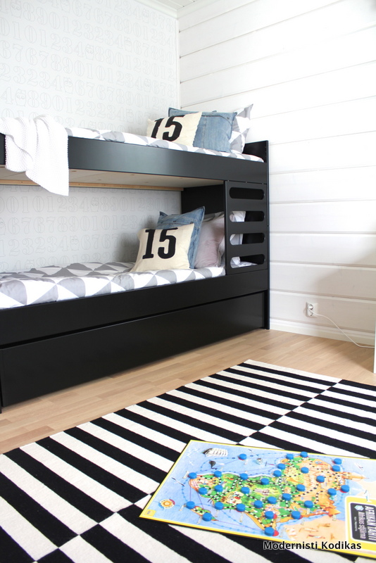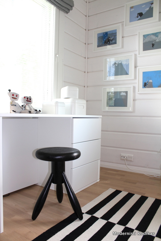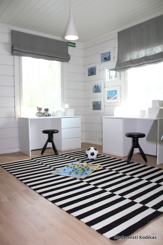 Koululaisten huoneen sisustus noudatti työhuoneen kanssa samaa linjaa. Harmaat laskosverhot toistuvat sielläkin, tekstiiliparinaan Ikean Stockholm rand-matto. Artekin Rocket jakkarat ja Innojok-valaisin kruunaavat kokonaisuuden.