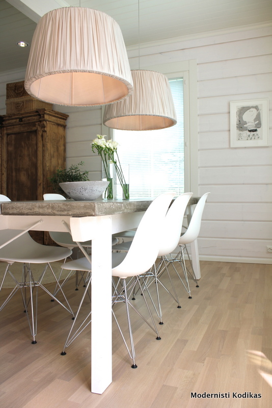 Ruokailutilan sisustuksessa on yhdistetty modernia ja perinteisempää tyyliä. Eamesin tuolit ja betonikantinen pöytä näyttivät yhdessä upeilta. Ruokapäydän päällä olevissa valaisimissa ei oltu omimmassa tyylissäni, mutta hirsitalon henkeen nämä sopivat kauniisti.