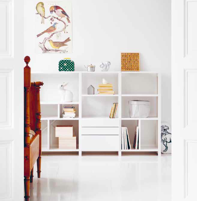 Monipuoliset lisäosat, kuten laatikot, hyllynjakajat ja ovet muuttavat tutun kalusteen kädenkäänteessä aivan uudenlaiseksi. Lastenhuoneen kaluste muuttuu työpisteeksi, olohuoneen hyllykkö kirjastoksi ja eteisen kenkähylly vaikka yöpöydäksi.