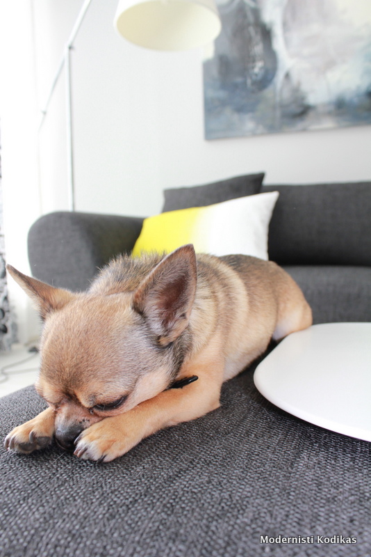 Ja keltaiset tyynyt sopivat tosi hyvin harmaaseen, meinasin unohtaa niitä kommentoida, kun aina ensin tulee kiinnitettyä huomiota näihin chihujuttuihin 😉