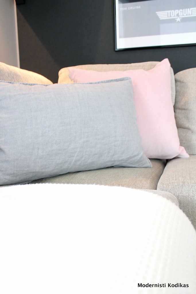 Vanhasta kodistamme seurannut sohva on tuollainen vaaleanharmaan beige (terve, mikä värikoodi!), joka ei ole ehkä ihan tämän hetkinen ykkössuosikkini, mutta siisti ja toimiva kylläkin. Sen pehmeä väritys soveltuu yllättävän monenlaisten väriyhdistelmien alustaksi.
