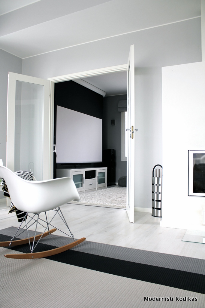 Kun pääsiäisen ja vapun kunniaksi iloisen keltaiset tyynyt siirtyivät olohuoneeseen, sai elokuvahuone myös uutta tunnelmaa tekstiileistä. Meillä ei siis ole olohuoneessa lainkaan televisiota, vaan pariovien takaa löytyy TV ja videotykki katseluita varten.
