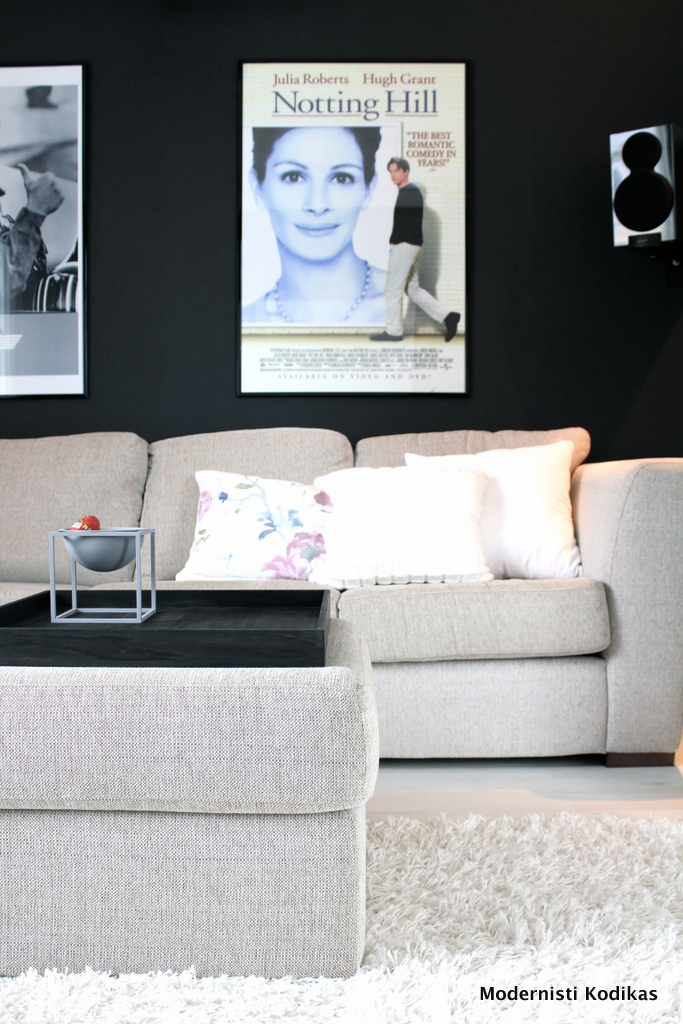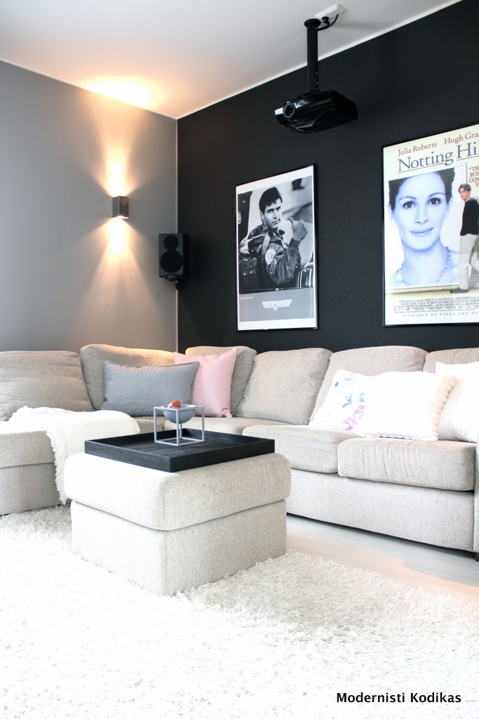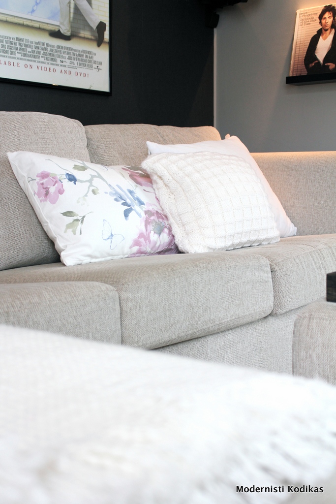 Mustan taustaseinän vuoksi olen pitänyt elokuvahuonetta aika graafisena ja myös mustavalkoisena. Yllätyin oikein itsekin, miten hyvin pastelliset sisustustyynyt sopivat ja toivat huoneeseen uudenlaisen fiiliksen.
