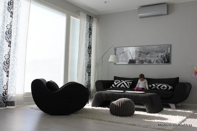 Vaikka kotimme on väritetty pääsiäiseen, ovat nämä kuvat hillityn harmaasta olohuoneestamme. Värit piristävät ja toimivat mainiosti yksityiskohtina, mutta eniten nautin selkeästä yleisilmeestä. Galileo-nojatuolin muotoilu viehättää minua päivästä toiseen. Graafisen valkoisen keittiön vastaparina toimivat modernin pyöristetyt muodot. Korkeissa ikkunoissa on Marimekon Ananas-kuosin verhot.