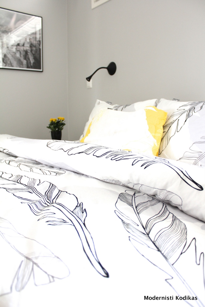 Meillä on nukuttu viime aikoina makoisia, mutta höyhenenkevyitä unia. Kevättalven Hobby hallin yhteistyöstä saadut Luhta Homen sulka-pussilakanat tuovat hillittyä tunnelmaa makuuhuoneeseen. Vieraspussilakanoina meillä on keltaiset peitot ja itsellemme tilasin tuon tuplatäkkiin sopivan pussilakanan. Yksi keltainen tyynyliina antaa pienen piristyksen muuten harmoniselle kuosille. Vaikka yleensä suosin yksivärisiä petivaatteita, pidän tästä sulkakuosista kovasti. Tämän kuvion syleilyssä on mukavaa matkata höyhensaarille..
