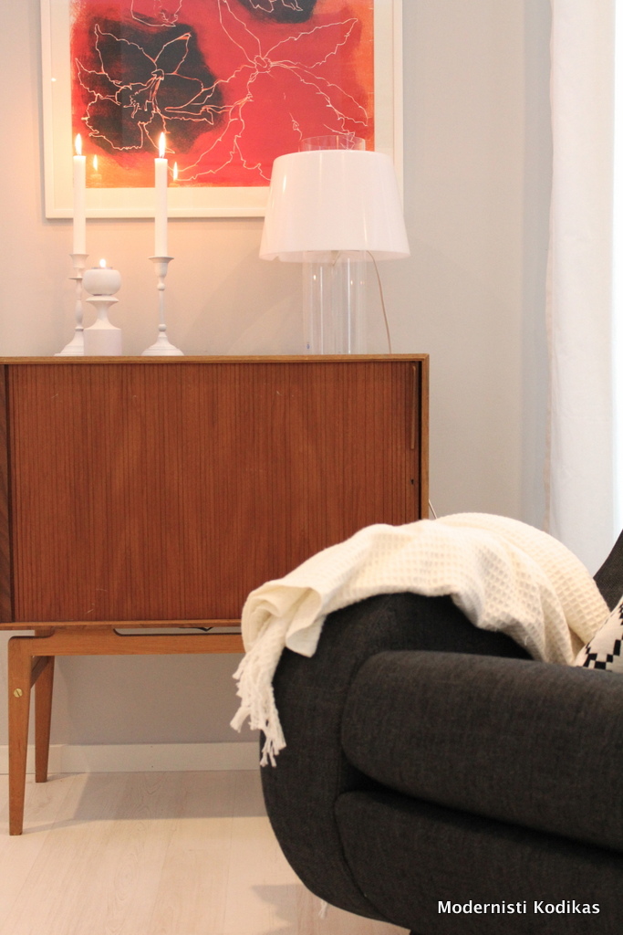 Tykkään näistä ihan hirmuisen paljon! Se, että ne on kierrätettyjä ja olen saanut niitä itse hieman tuunata tekee niistä entistäkin kivemmat. 1960-luvun televisiokaapissa on vieläkin moitteettomasti toimiva liukuovimekanismi. Kaapin sisään sujautin Zeppelin Air iPad-telakan. Kun musiikkia halutaan kuunnella, ei muuta kun ovi auki. Pidän siitä, että nyt olohuoneen sisustuksessa ei ole näkyvillä mitään tekniikkaa.