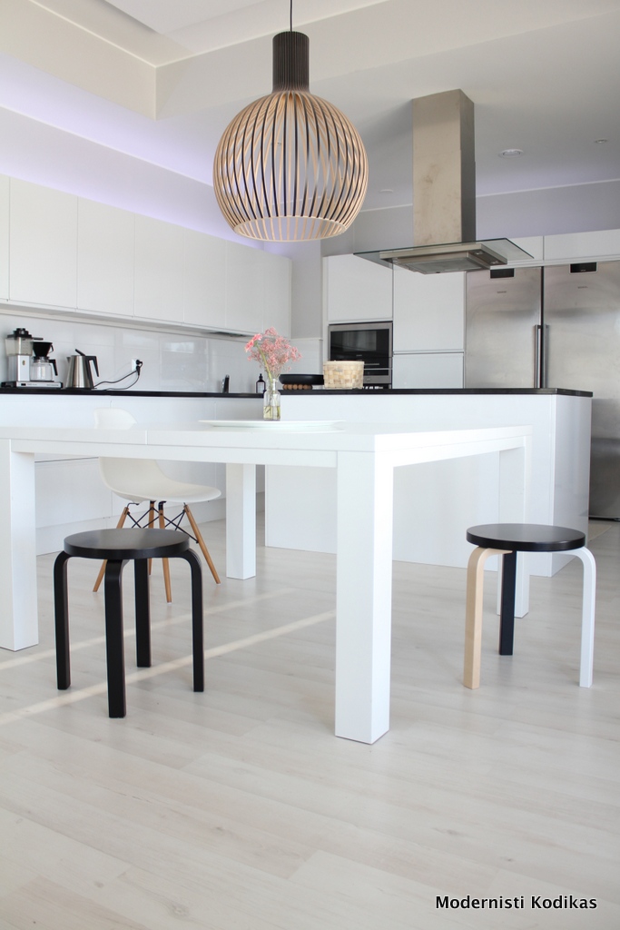 Artekin jakkarat ovat tässä lähinnä kuvastamassa, miltä keittiö näyttäisi kevyemmillä tuoleilla. Jakkarat saisivat toimia lisäistuimina tarvittaessa.