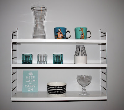 String-hylly on kaunis. Mutta kyllä se kaipaa kyytiinsä myös kauniita esineitä. Nyt asettelin hyllyille turkoosin sävyisen aseltelman, josta puuttuu se jokin. Kivoja ja kauniita esineitä jokainen, mutta sitä pientä yllättävää yksityiskohtaa jään kaipaamaan.