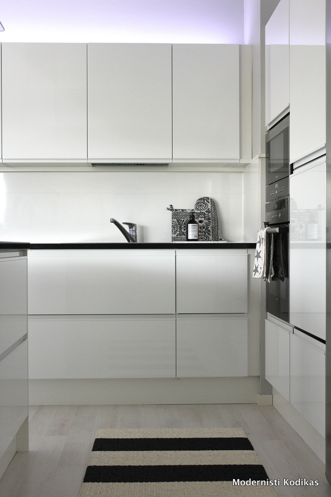 Hei Kerttu, ihastuttava keittiö teillä! Meilläkin on ovet ja välitilan lasi musta taso, ja ottaisin edelleen samat puolentoista vuoden vankalla kokemuksella;) ihan puhtaanapidon kannalta. Edellisessä kodissa oli himmeämpi versio, ja kaapistojen pyyhkiminen oli aika haasteellista. Aina jäi jälkiä. Nyt on huomattavasti helpompaa. Mutta ymmärrän kyllä kun kaikki kiiltää, se saattaa ajan saatossa ärsyttää. Meidän lattia on iso musta rouhea kivilaatta, joak tasapainottaa hiukan tätä kiiltävää kokonaisuutta.