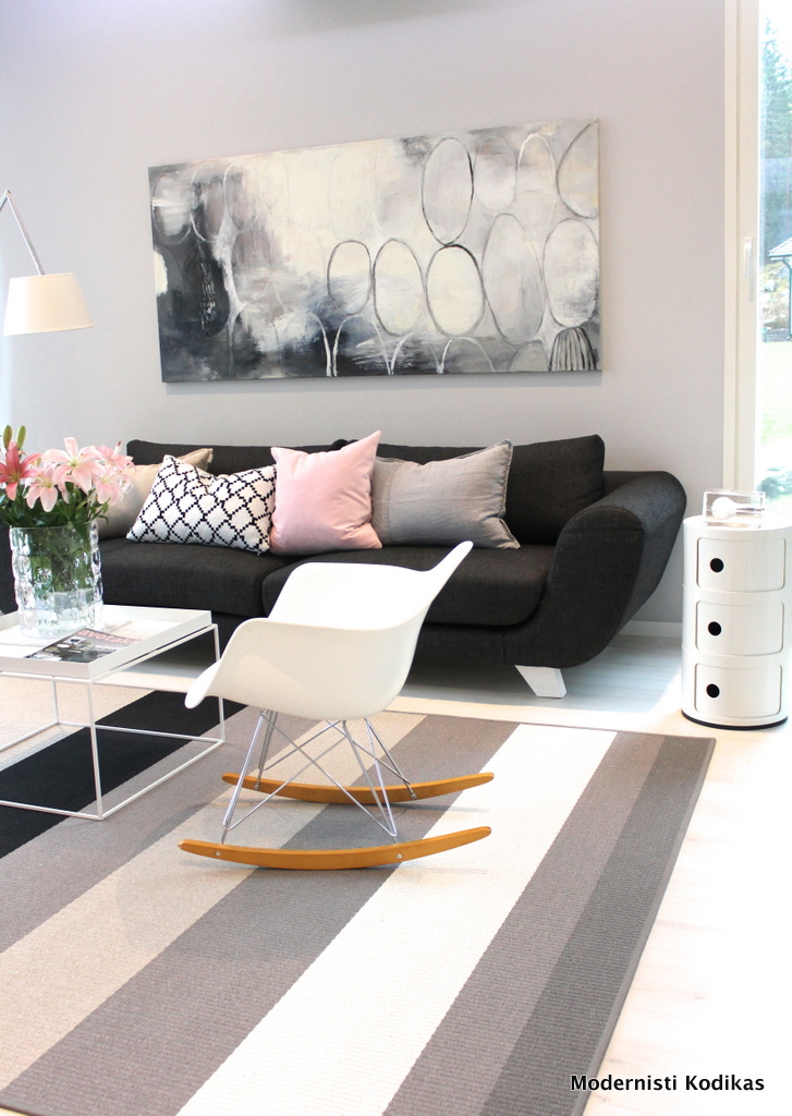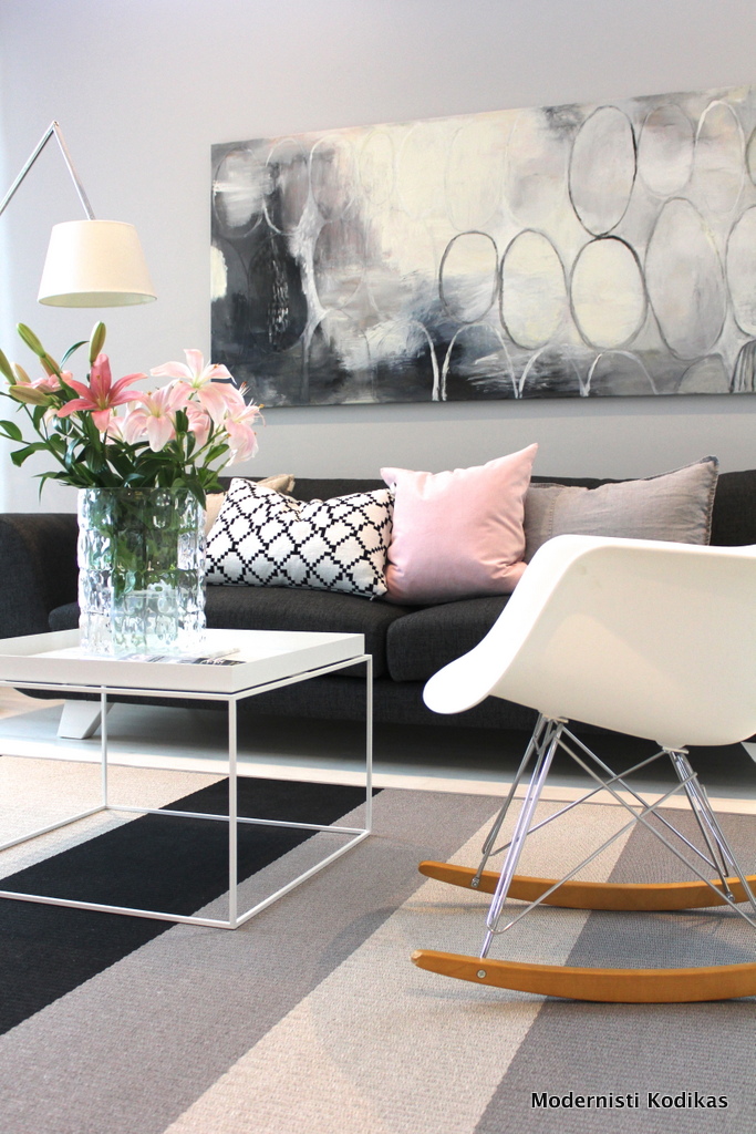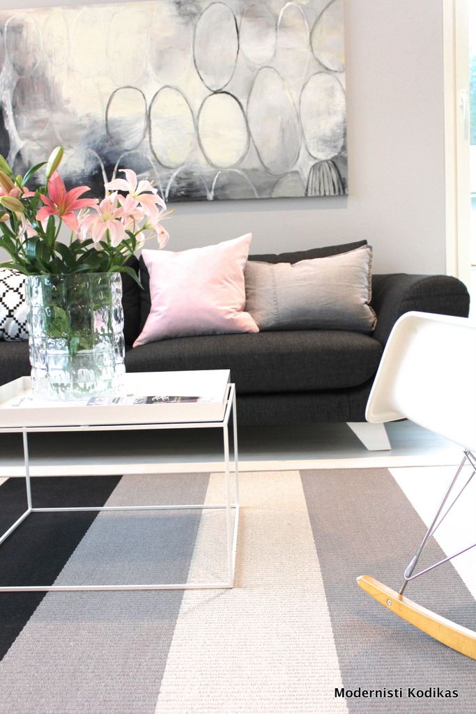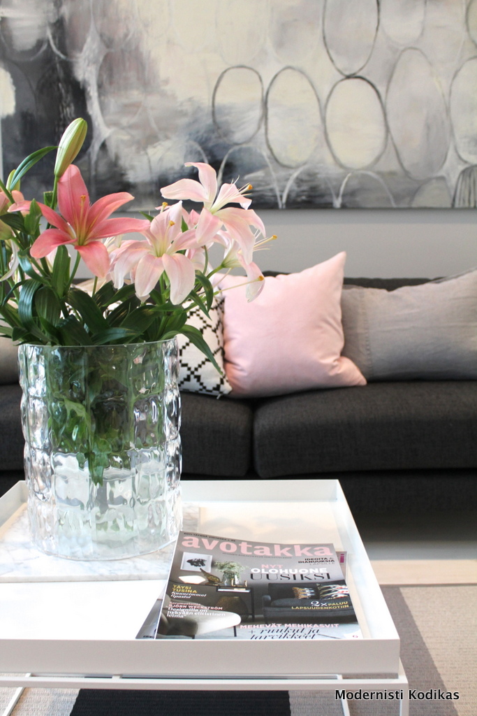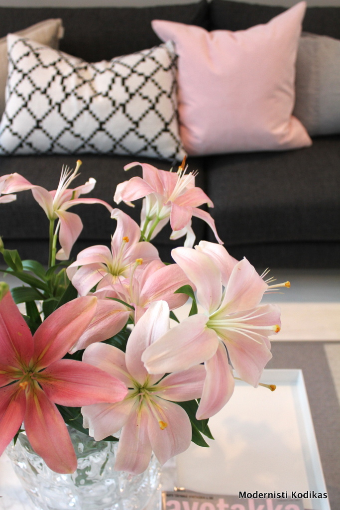 Kauniin näköistä, niinkuin aina kodissanne! Meidän olohuoneeseenkin hiipii pastellin roosa. Itse ehkä hieman vierastan voimakkaita värejä, joten se tuntui jotenkin sopivalta harmaan ja vaalean kanssa. 🙂