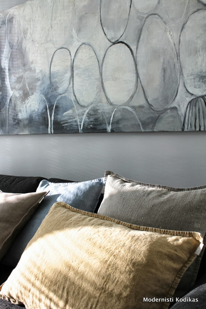 Olohuoneen syysilmeen rakentaminen jatkuu sisustustyynyjen etsinnällä. Kävin hakemassa SisustusIlosta tyynyjä kotisovitukseen. On muuten ihan eri juttu vertailla sävyjä myymälän keinovalossa kun kotona, joten visuaalisesti tarkoille tyypeille suosittelen tiedustelemaan kotisovituksen mahdollisuutta. Olen etsinyt oikeanlaisia tyynyjä jo useamman viikon ja tehtävä on ollut yllättävän haastava. Tavoitteena on muuttaa tunnelma graafisen mustavalkoisesta modernin pehmeäksi. Jos nyt yhtään tajuatte, mitä tarkoitan 😀