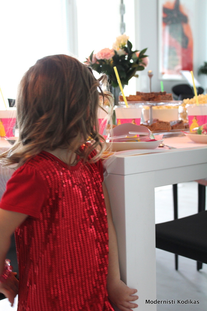 ”Saako nousta pöydästä ja kiitos!” Kun makeaa oli mahan täydeltä, oli leikin aika. Meidän tytöllä on muuten prinsessavillityksen oheen tullut ihana ”glitter-kausi” ja asuissa tulisi olla jotain kiiltävää. Itse olen suosinut tähän saakka klassisia lastenvaatteita, mutta nyt pitäisi olla säihkettä ihan arkipäivän asussakin. Tämä punainen paljettimekko oli päivänsankarin ehdoton valinta juhlavaatteeksi.