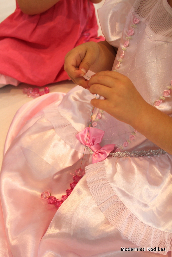 Ohjelmassa oli seuraavaksi onginta. Viritin työhuoneen ovelle lakanan ja ripustin keppiin narulla roikkumaan pikkuisen pärekorin. Yksi kerrallaan vieraat saivat onkia ja jokaiselle oli valmiina saaliiksi vaaleanpunainen pikkuinen paperipussi. Sieltä löytyi pieni muumipatukka, keijukaispinni sekä ”jalokiviä”. Näistä muovihelmistä neidit saivatkin askarrella itselleen käsi- tai kaulakorun mukaansa. Tämä oli kiva ohjelmanumero ja oli liikuttavaa katsoa tarkkaa askartelutyötä. Tässä vaiheessa päivänsankari oli jo ehtinyt vaihtaa vaatteet 😀