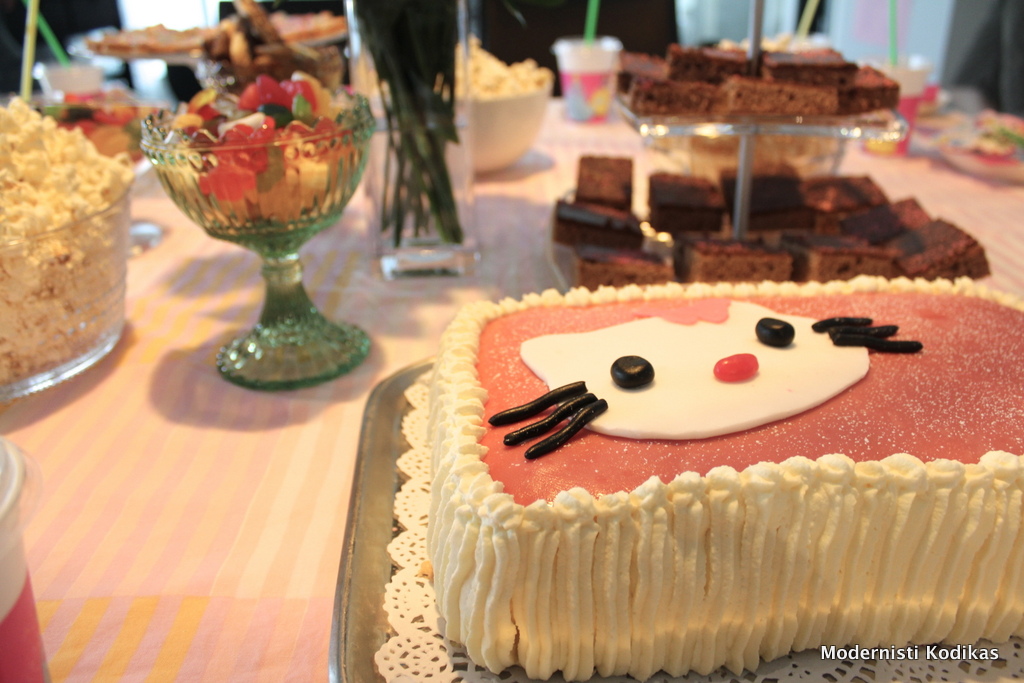 Juhlapöydästä löytyi Hello Kitty-kakku, mokkapaloja, todella suosituiksi nousseita nakki-lihapulla-viinirypäle-cocktailtikkuja, popcorneja, Raffeleita, keksejä ja karkkia. Tarjoilut maistuivat mainiosti ja oli kiva kuunnella tyttöjen jutustelua ruokapöydän äärellä.