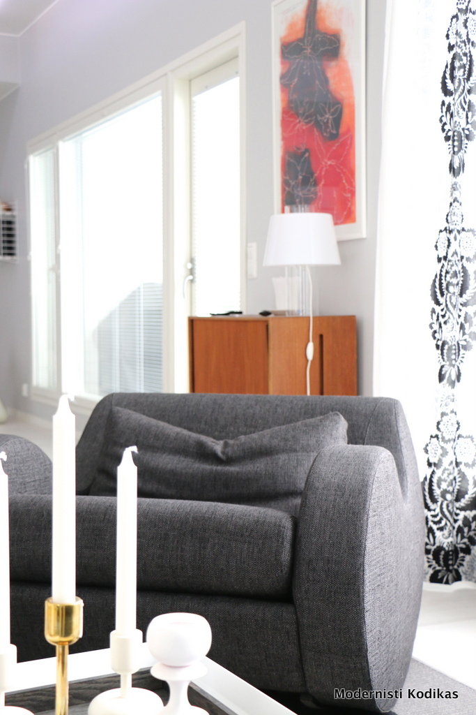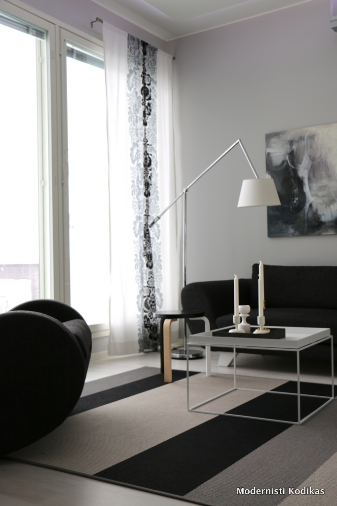 Tämä on se vähän tutumpi kuvakulma, jossa näkyvät isot ikkunat, Hayn Tray-pöytä, Artekin jakkara sekä nurkassa nököttävä jalkavalaisin. Kuvassa näkyy aavistus katon alaslaskun epäsuoraa valoa. Tekstiileissä mennään kotimaisella linjalla: verhot Marimekkoa ja matto Woodnotesia.