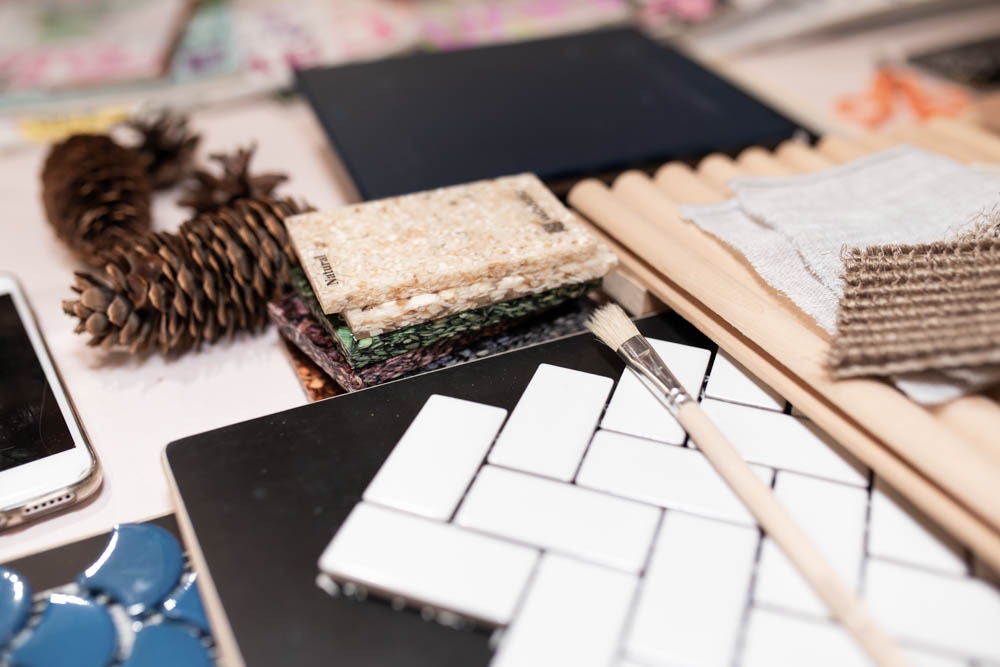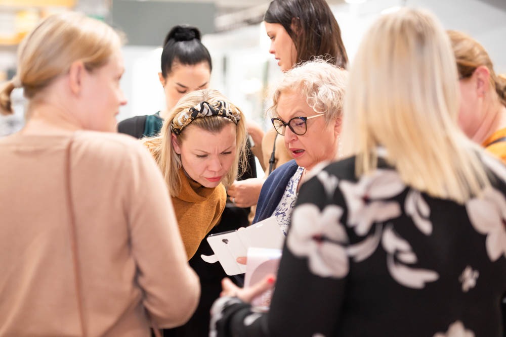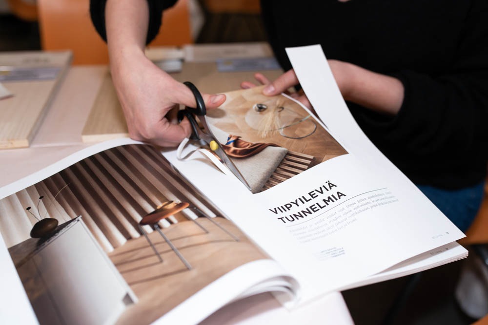 Illan aikana testasimme sisustusammattilaisten työkalua eli moodboardin tekemistä. Maru alusti työskentelyä sillä, että kyseessä ole mikä tahansa askartelutehtävä vaan myös ammattilaiskäytössä oleva suunnittelu- ja ideointityökalu, jonka kautta voi saada varmistuksen siitä, että kokonaisuus toimii yhteen.