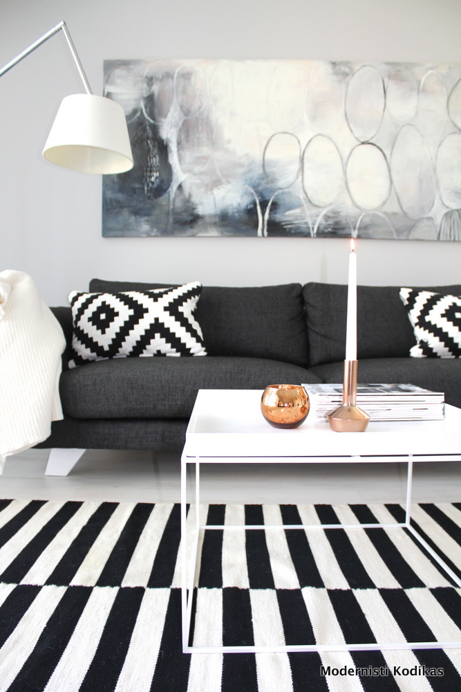 Clas Ohlsonin metallikori on siirtynyt terassilta sisätiloihin. Pidän kontrastista, jonka metalli ja pehmeät luonnonmateriaali saa aikaan. Sen sijaan en pidä koirankarvoista villamatolla, mutta menköön nyt tällä kertaa 😉