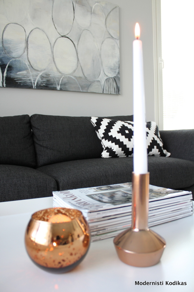 Tein pieniä muutoksia olohuoneessamme kuuden euron panoksella. Nämä eurot menivät tuohon matalaan kupariseen tuikkukuppiin, ostin sen niinkin tyylikkäästä designkaupasta kuin Anttila 😉 Samoja kupposia oli myös muissa metallinhohtoväreissä ja ne jäivät vähän kaivelemaan mieltä… Näyttää kauniilta ja on mielestäni oikein hyvä vaihtoehto sadan euron design-sijoitukselle, varsinkin jos ei ole ihan varma, kauanko henkilökohtainen kupari-innostus kestää.