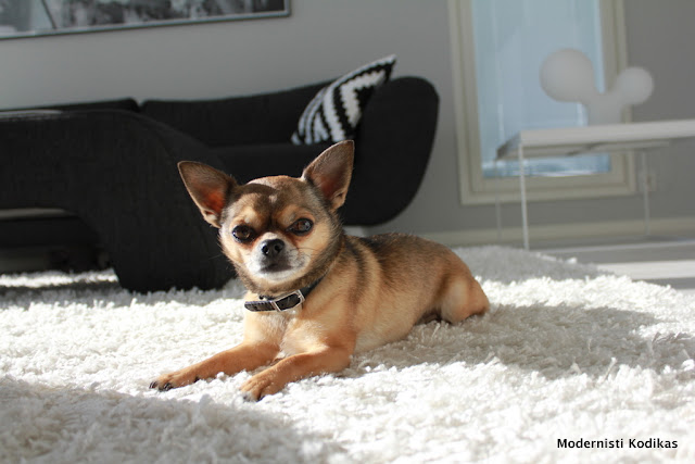 Tyynyt on just hyvät, ja myös niin mun näköiset, että täytyy hankkia meillekin! Ihanan rauhallinen tunnelma olohuoneessa, ja niin monta upeaa yksityiskohtaa, unohtamatta tietenkään Hugoa. 🙂
