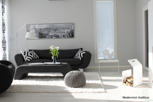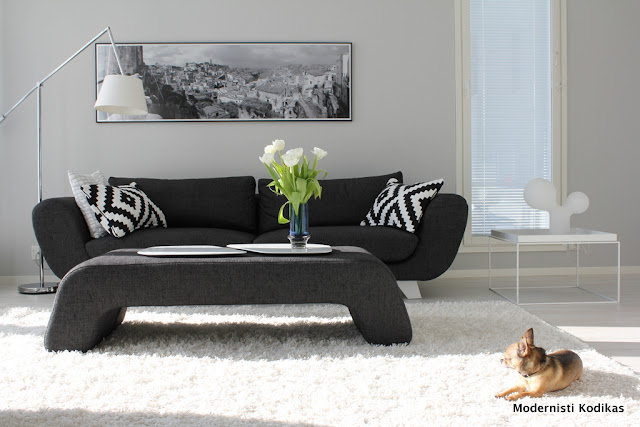 Olohuoneen sisustuksessa palasin mustan, valkoisen ja harmaan kauniisiin perussävyihin. Tyttären värikkään huoneen sisustamisen jälkeen tämä tuntuu oikein hyvältä ja raikkaalta, värittömyydestään huolimatta myös keväiseltä.