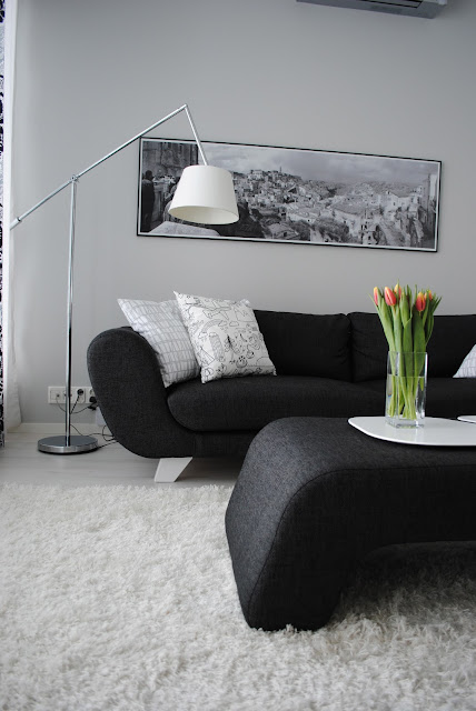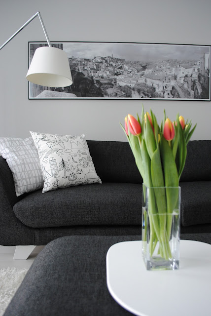Viikonloppua ilahduttavat reippaan väriset tulppaanit. Sohvalla on Finlayssonin Coronna-tyynyn kaverina kirpputorilta tällä viikolla uutena ostamani kuviotyyny. Se on tosi hauska ja mieluinen, tuo sellaista hillittyä huumoria sisustukseen.