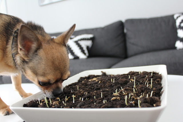 Kevät- ja pääsiäisvirityksiä on meidänkin kotiin laitettu. Vuosittainen suuri jännityksen aiheeni on, kuinka saan pääsiäisruohon kasvamaan. On se elo mennyt jännäksi kuulkaas! Kun siinä sitten parin päivän hirmuisen hermopaineen jälkeen näkee jotain elävää kasvavan mullan seasta, tekisi mieli vetää villit voitontanssit ja skoolata lasi skumppaa ;D