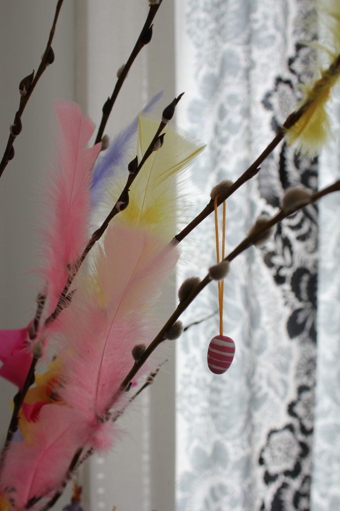 Meidän perheessämme ei synny supetyylikkäitä design-vitsoja, vaan iloisen värikkäitä höyhen- ja silkkipaperiviritelmiä. Sävyt ovat luonnollisesti kevään trendivärit lapsen lempivärit. Me käymme virpomassa vain tutuilla ovilla lähitaloissa ja sen jälkeen mummolassa.