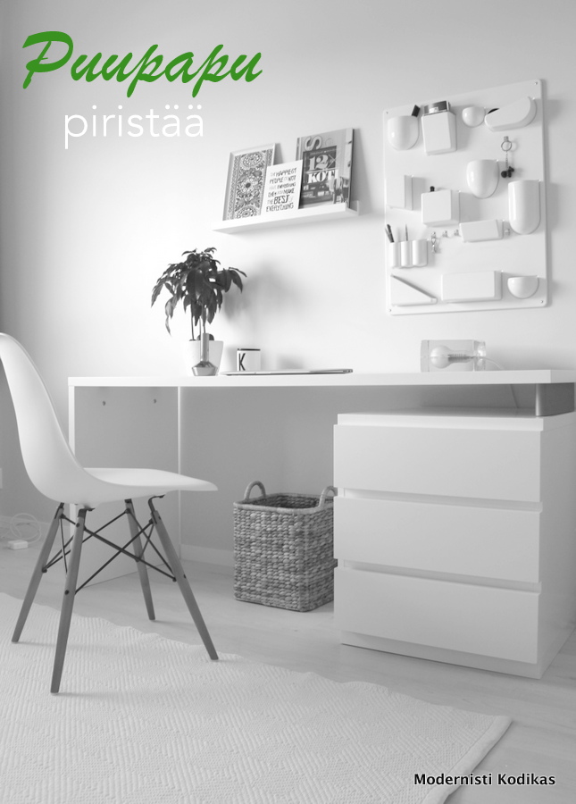 Jos työhuone alkaa vaikuttaa liian hämärältä, niin siirrän kasvin olohuoneeseen. Kasva, kasva, pikkuinen! Tuo iloa, happea ja eloa päiviin, kun aaneloset kyllästyttävät ja ajatukseni sieppaa joku alhainen aikavaras. Työpöydän ääressä pitäisi usein syntyä parhaat ideat. Eikö juuri siksi sen pitäisi olla yksi kodin kauneimmista paikoista?