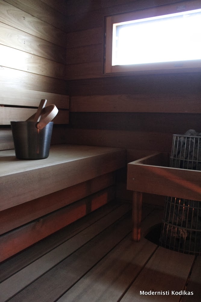 Tuo Teidän pukuhuone on aivan ihana, tuollaista haluaisin itsekkin kodinhoitohuoneeseemme! Ja tuo sauna,niin kaunis! Ja hetken jouduin miettimään että hetkinen, Teillä on sama sanuna kuin meillä! 😀 meillä on vain tummat lauteet eikä meillä ole noin kaunista seinälaudoitusta. Kiuaskin taitaa olla sama 😀 ihanaa nähdä että muillakin sama maku.