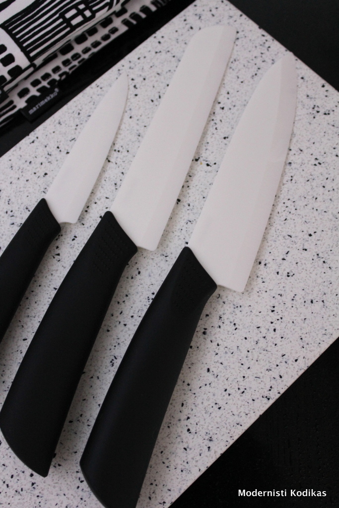 Meille tuli valkoiset keraamiset veitset vuosi sitten joululahjaksi ja muita en enää käyttäisikään 🙂 Ovat niin kauniit ja niin hyvät!
